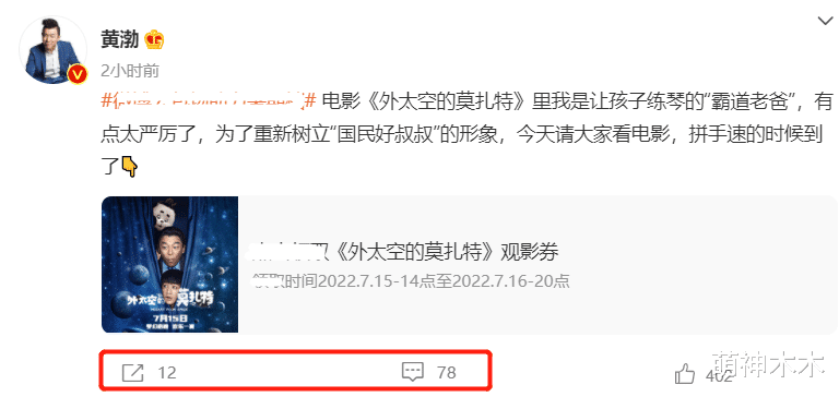 轉頭一看,《外太空的莫扎特》的主演黃渤已經在微博上發(fā)了一條微博,但是熱度卻很低,連一百條評論都沒有。
