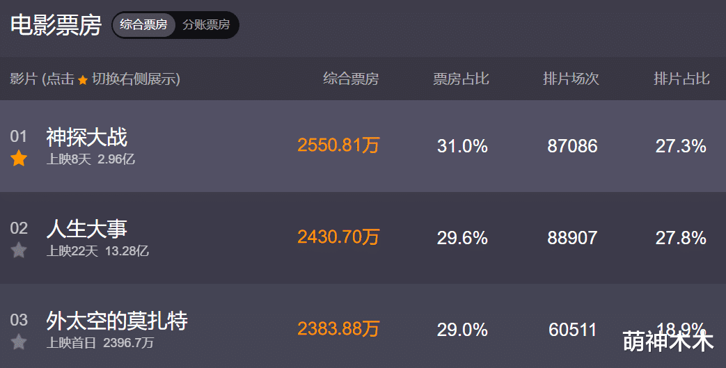 或者直接看三部電影的票房排名,根據(jù)一家專業(yè) APP的數(shù)據(jù),《外太空的莫扎特》首日票房竟然排到了第三名。