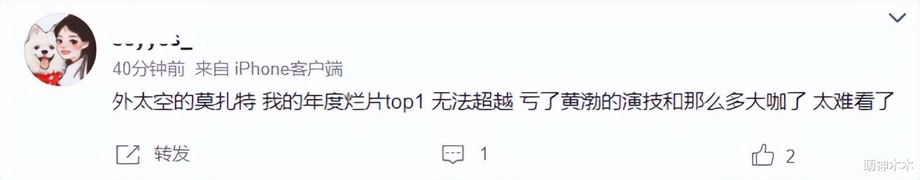 網友們直呼《外太空的莫扎特》是他今年最爛的電影,因為黃渤演技太差,還有那么多大咖,所以網友們才會說,看《外太空的莫扎特》一定是腦子進水了。