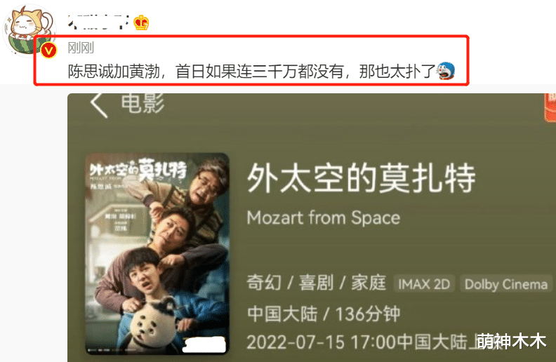 業(yè)內大 V更是表示,如果《外太空的莫扎特》首日票房不破三千萬,那簡直就是“撲街”。