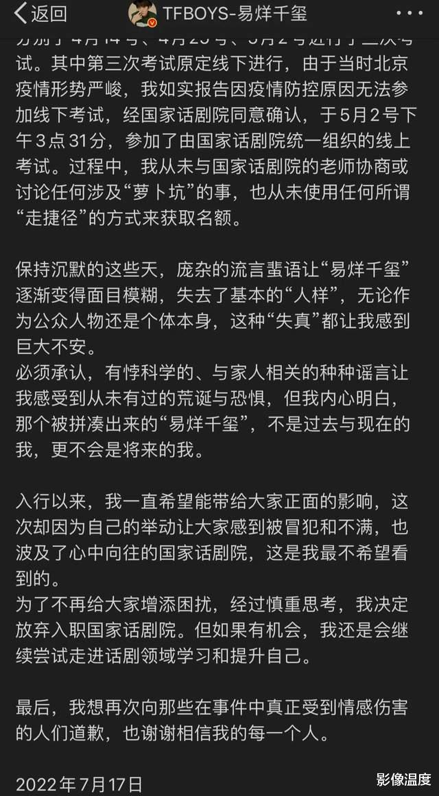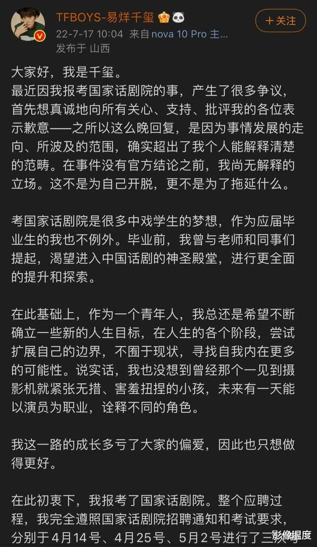 易烊千璽入編國家話劇院的事情已過去多日,7月17日,易烊千璽沉默多日后,發長文表示:自己選擇放棄入編國家話劇院!