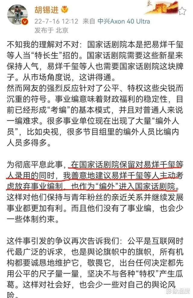 此前,胡錫進也建議易烊千璽放棄事業編: