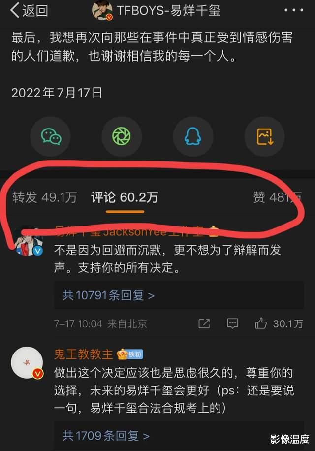 易烊千璽發文時間是7月17日中午10點04,截至12點57分,已經獲得60多萬評論,439萬點贊: