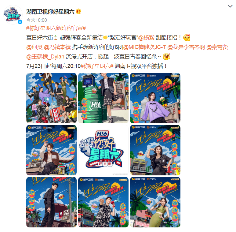 7月17日,湖南衛視你好星期六的官微上發布了《你好星期六》新陣容官宣,并配文案:夏日好六街,超強陣容全新集結,何炅、馮禧攜手煥新陣容的好6團檀健次、李雪琴、秦霄賢、王鶴棣,沉浸式開店,掀起一波夏日青春回憶殺。