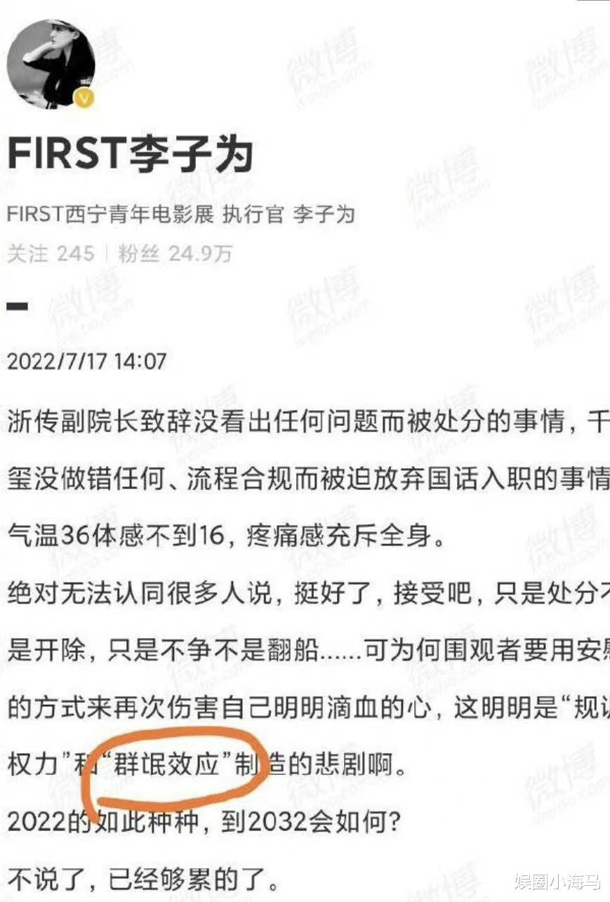 原因是李子為在發文中表示易烊千璽放棄入職國家話劇院并不是他本人的過錯,而是因為“群氓效應”制造的悲劇。