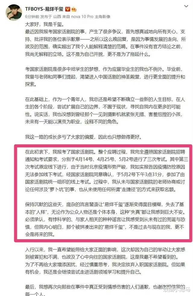 在回應中,易烊千璽表示由于報考國家話劇院產生的爭議和影響已經超出了他個人能解釋清楚的范疇。而且關于他“走捷徑”、占“蘿卜坑”等等不實的謠言也影響到了他的生活和身心。