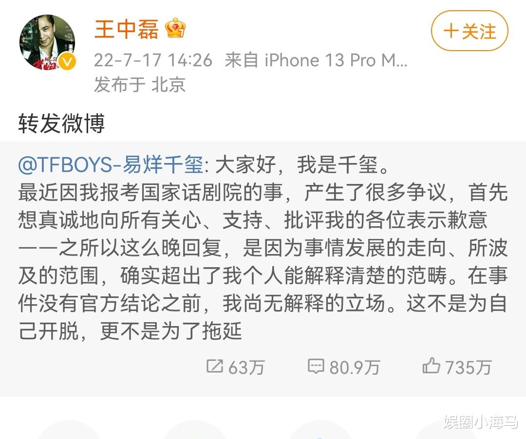 在易烊千璽發出放棄入職國家話劇院的聲明后,華誼兄弟老總王中磊便出面力挺,不懼輿論壓力轉發了易烊千璽的這條聲明。