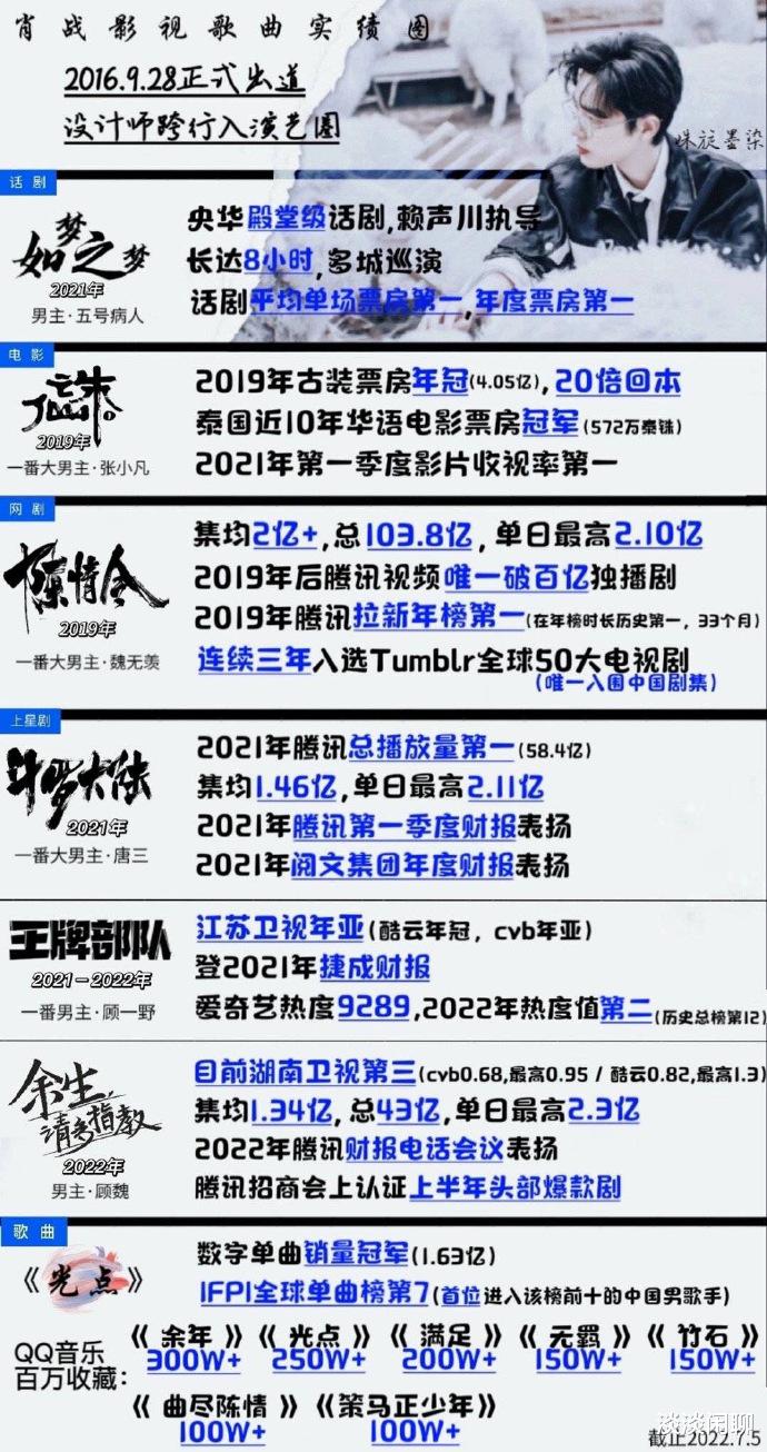 近日,有網友總結了肖戰這幾年來的作品成績,真是讓人嘆為觀止。《陳情令》一炮封神,均集2億播放,TX唯一破百億獨播劇;20倍回本的《誅仙》電影圈小試牛刀;《斗羅大陸》2021年TX總播放量第一;《王牌部隊》江蘇年亞,酷云年冠;《余生請多指教》湖南第三,被TX認定上半年頭部爆劇;《光點》數字單曲冠軍1.63億,IFPI全球單曲第7;主演8小時的《如夢之夢》,平均單場票房第一,年度票房第一。