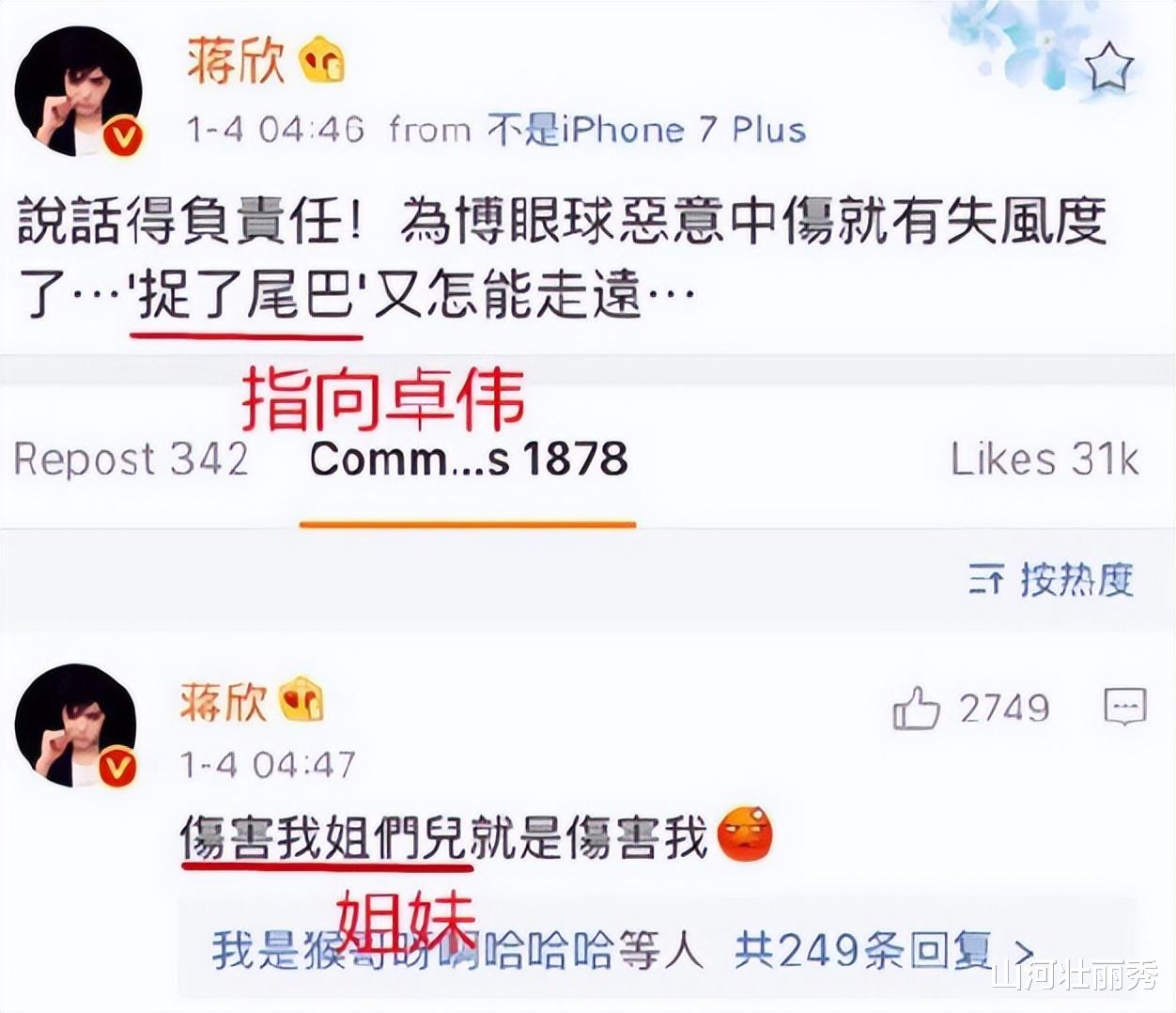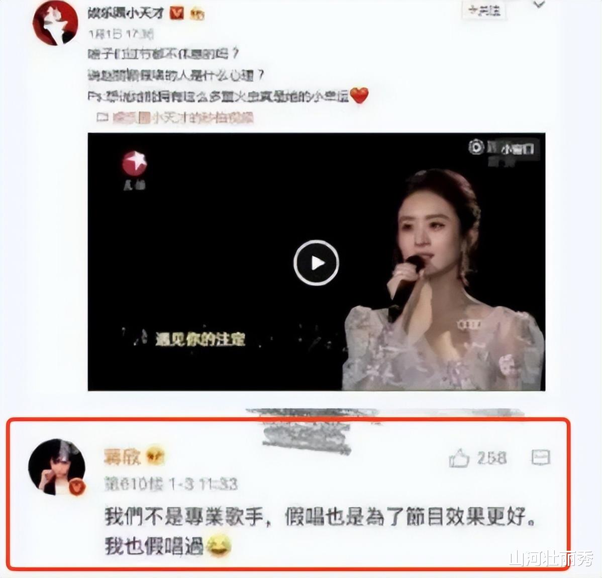 蔣欣在質疑趙麗穎假唱的文章下面評論,說大家都不是專業的歌手,假唱其實也沒什么過分的,畢竟都是為了節目效果。而且她還義正詞嚴地表示,自己之前就假唱過。