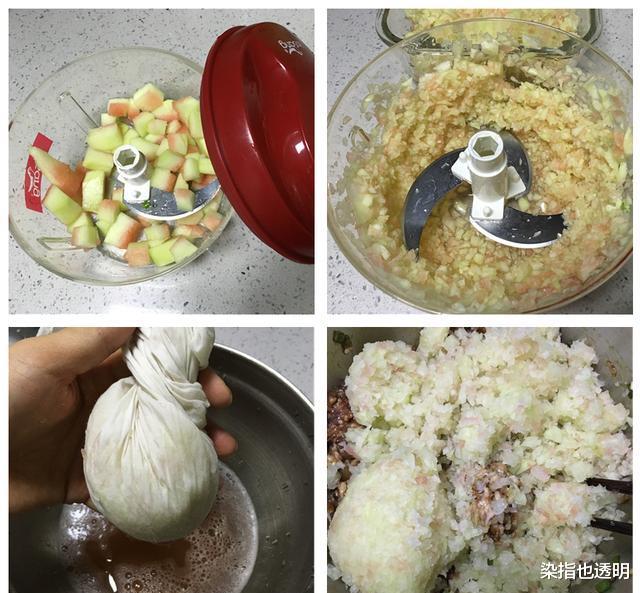 做法:首先把西瓜皮外面那層綠綠的外皮切掉,只留里面白色的瓤,接著把去掉外皮的西瓜皮放入絞肉機里,打成小碎塊即可;前腿肉洗凈后切片再切絲,然后放入絞肉機攪成肉泥備用;