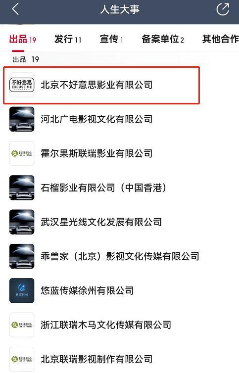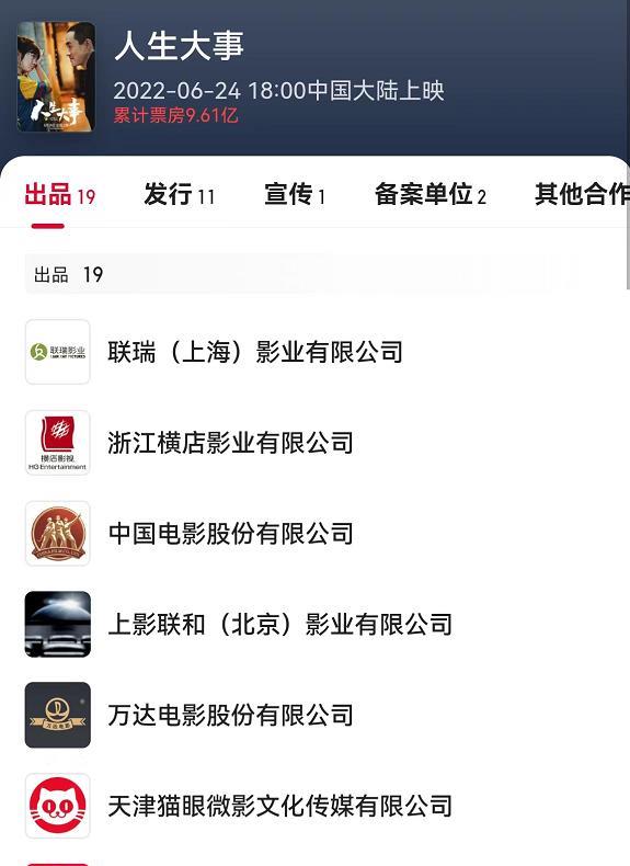 雖然《人生大事》投資額不算太高,但為了風險均攤以及方便獲取資源,電影的出品方多達19家,其中投資占比最大、也獲利最多的是第一出品方聯瑞影業,翻看出品方名單,會發現除了排名第一的聯瑞影業外,下面還有浙江聯瑞木馬文化傳媒有限公司和北京聯瑞影視制作有限公司,說明聯瑞通過三家公司參與了電影投資。