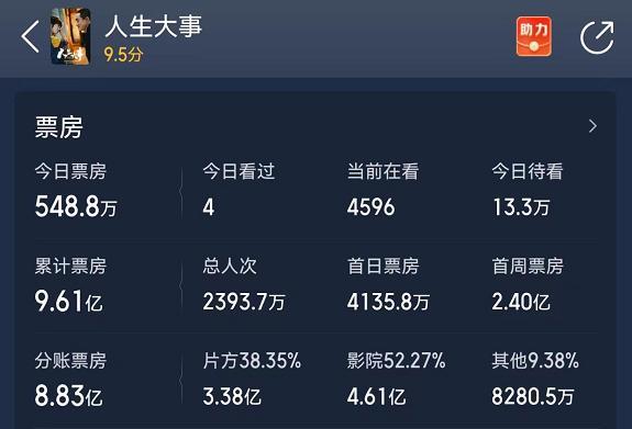 知道了制片成本,算電影利潤就相對簡單了。截止到發稿,《人生大事》累計票房達到9.6億,片方分賬票房達到3.38億,那么減掉6000萬成本,利潤已經高達2.78億,等到晚上就會超過2.8億。而專業票房軟件對電影的票房總預測高達16.27億,按照這個數字計算,最終分賬票房有望超過6.2億,那么投資方最終盈利將超過5.6億,可以說賺得盆缽皆滿。