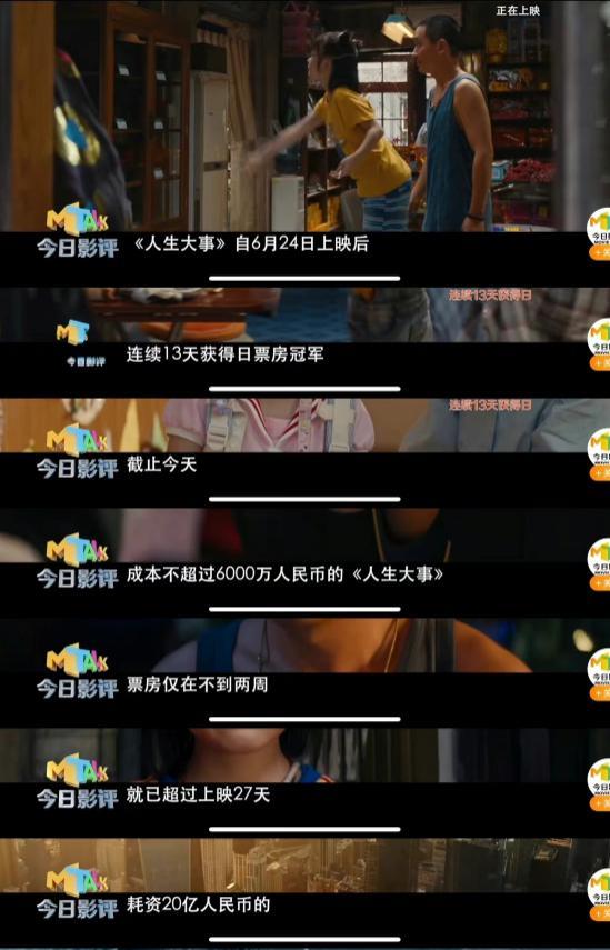 近日,電影頻道“今日影評”欄目在報道電影《人生大事》時,有這樣一段話:“《人生大事》自6月24日上映后,連續13天獲得日票房冠軍,截至今天,成本不超過6000萬人民幣的《人生大事》,票房僅在不到兩周的時間里就已超過上映27天、耗資20億人民幣的好萊塢大片《侏羅紀世界3》。”