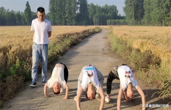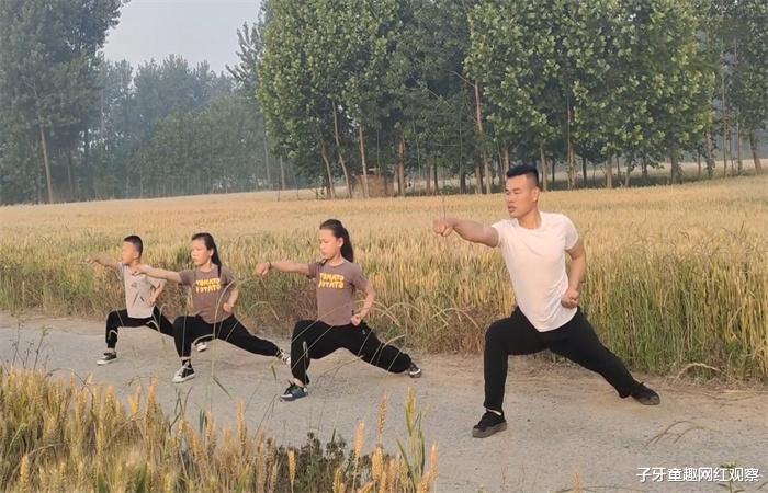 從此,一位父親和三個(gè)萌娃不論嚴(yán)冬還是酷暑,每日清晨6點(diǎn),田地間、樹(shù)林間、馬路旁總會(huì)準(zhǔn)時(shí)出現(xiàn)他們操練的身影。跑操、踢腿、站樁、蹲馬步,劉龍每天堅(jiān)持帶三個(gè)孩子練習(xí)基本功,習(xí)武多年的他深知基本功扎實(shí)的重要性。