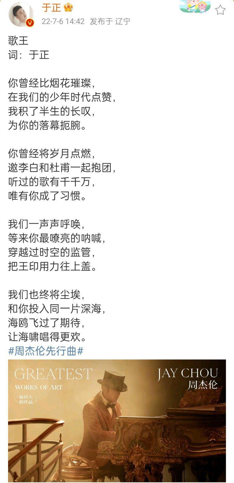 7月5日,于正真的蹭到了,掌握了流量密碼,周杰倫發新歌,他寫歌詞《歌王》致敬,從歌詞里感受到了于正對周杰倫的喜歡,“聽過的歌千千萬,唯有你成了習慣”,被網友質疑還直接正面回應就是蹭,“這次是真的蹭,主要是太喜歡周杰倫的歌了”,果然男女老少都躲不過周杰倫!