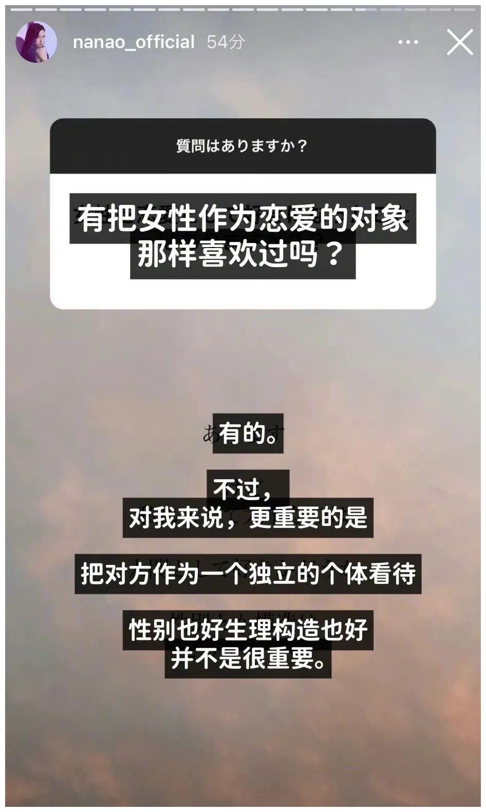 近日菜菜緒在社交平臺上回答記者問,有把女性作為戀愛的對象那樣喜歡過。她說,把對方當成一個獨立的個體看待,性別也好生理結構也好,并不是很重要。