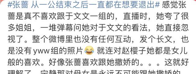 確實,張薔這次發文僅提到了薛凱琪和譚維維兩位“五公”搭檔,但卻放出了與多位姐姐的合照,其中就包括了風評最不好的趙櫻子,但就是沒有于文文的身影。再加上其在直播上cue了趙夢、王心凌等大半姐姐,評論區都希望她能評價下于文文,但她卻選擇了無視,所以才會有人質疑其是不是對于文文有意見。