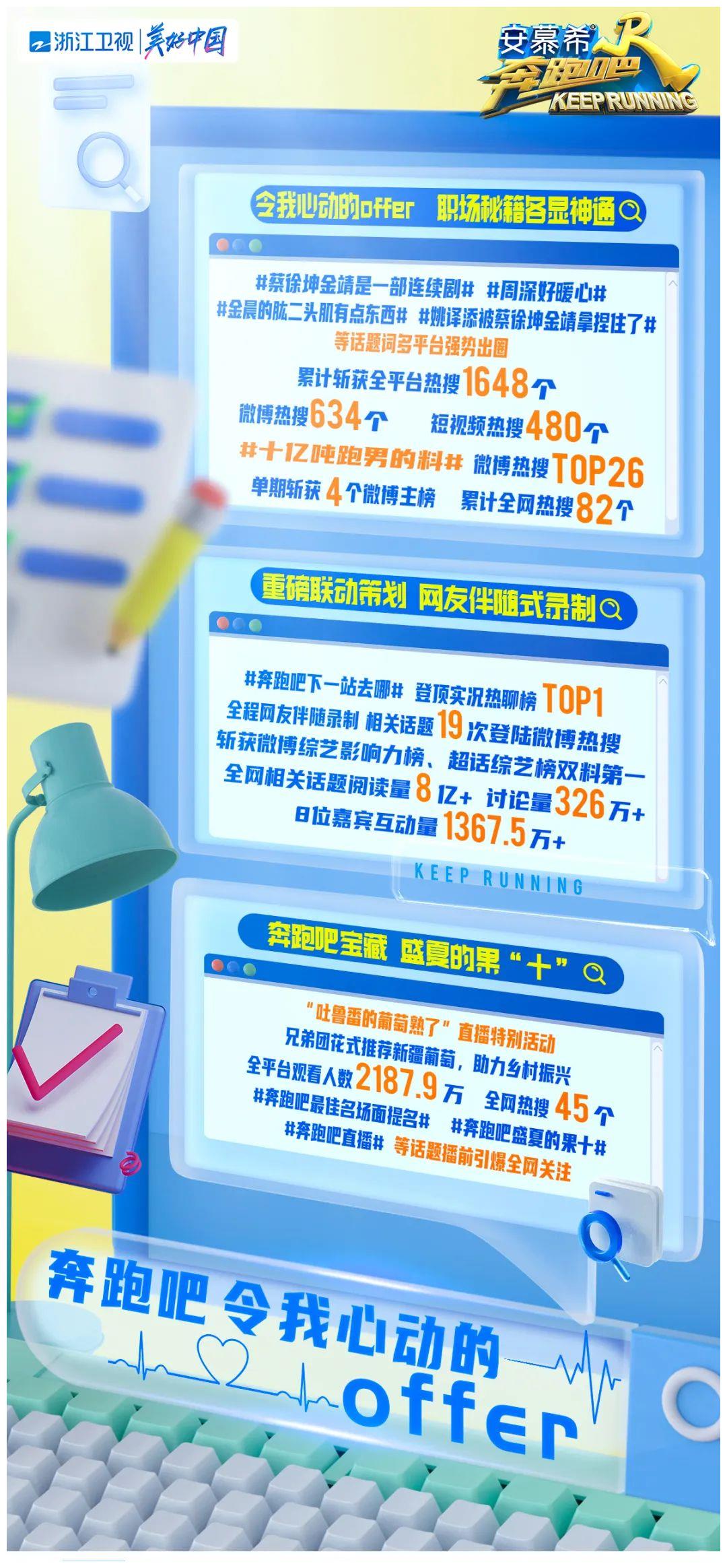 上周五20:20,浙江衛視安慕?!侗寂馨伞返谑静コ隽说诎似?。節目中,兄弟團成員李晨、楊穎、沙溢、蔡徐坤、白鹿、周深,攜手飛行嘉賓金晨、李誕、楊迪、金靖,通過影視行業人才雙選會和三場行業大會模擬職場,在歡樂中展現了人才的發展以及行業的發展。本周,節目單期斬獲4個微博主榜熱搜,累計全網熱搜82個。其中,#蔡徐坤金靖是一部連續劇#、#周深好暖心#、#金晨的肱二頭肌有點東西#、#姚譯添被蔡徐坤金靖拿捏住了#等話題詞多平臺強勢出圈,#十億噸跑男的料#更是登上微博熱搜TOP26。截至目前,節目累計斬獲全平臺熱搜1648個,微博熱搜634個,短視頻平臺熱搜480個。此外,節目重磅策劃#奔跑吧下一站去哪#登頂實況熱聊榜TOP1,眾多網友全程伴隨錄制;相關話題19次登陸微博熱搜,斬獲微博綜藝影響力榜、超話綜藝榜雙料第一;全網相關話題閱讀量高達8億,討論量超326萬,8位嘉賓互動量超1367.5萬。還有于6月29日舉行的“吐魯番的葡萄熟了”直播特別活動,吸引了2187.9萬網友觀看,并斬獲全網熱搜45個,#奔跑吧最佳名場面提名#、#奔跑吧盛夏的果十#、#奔跑吧直播#等話題更是在播前就引爆了全網關注。