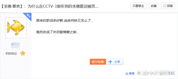 但我清晰地記得,以前在看相關晚會的時候,歌手誓言把這一句唱成了“當我在關閉愛情窗之前”。這些微的改動看似沒什么,但卻把原作中的佛性給大打折扣,讓人怎么聽都覺得別扭。