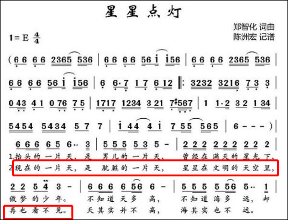 原歌詞“現(xiàn)在的一片天,是骯臟的一片天,星星在文明的天空里,再也看不見(jiàn)”被改為了“現(xiàn)在的一片天,是晴朗的一片天,星星在文明的天空里,總是看得見(jiàn)”。