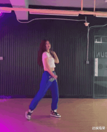 陳亞男穿著露臍裝,休閑褲,打扮時髦,一頭卷發散落著,對著鏡頭來了一段舞蹈。