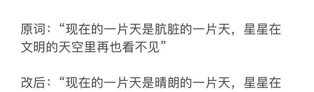 自然,這樣的歌詞,擺到現下確實會引起部分人的不適。甚至不惜將歌詞中的“骯臟”改為了“晴朗”,讓星星在文明中總能看得見。