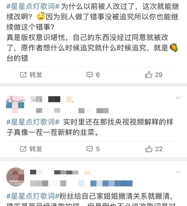 其觀點是:若是芒果買了《星星點燈》的版權,那么就可以隨心所欲地改編。原作者收了錢,又要來質疑不該改歌詞,那就顯得有些又當又立了。
