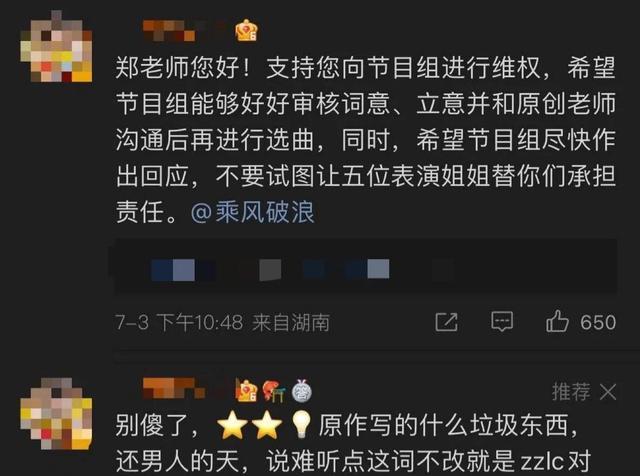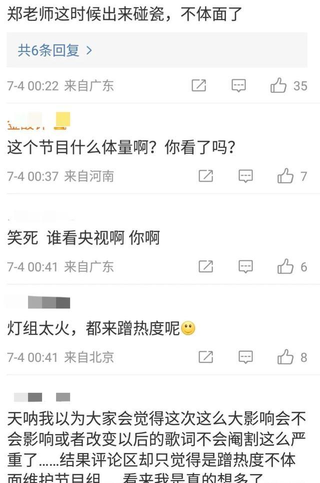 “怪節目組吧,跟姐姐們無關,你要改歌詞不提前跟原作溝通?”“如果涉及到版權,之前應該提前溝通吧?”“別亂開槍,找亂改歌詞的人,歌詞不是姐姐改的。”