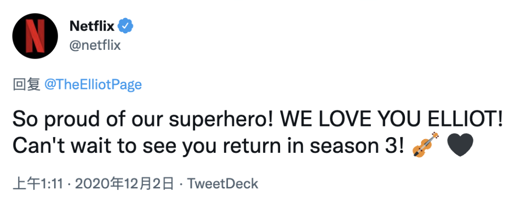 大意:為我們的超級英雄感到驕傲,我們愛你,期待看到你在第三季的回歸!