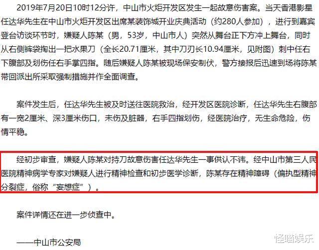 經(jīng)過中山市第三人民醫(yī)院精神病學(xué)專家的診斷,確認(rèn)刺傷任達(dá)華的兇手患有精神障礙,也就是俗稱的“妄想癥”。