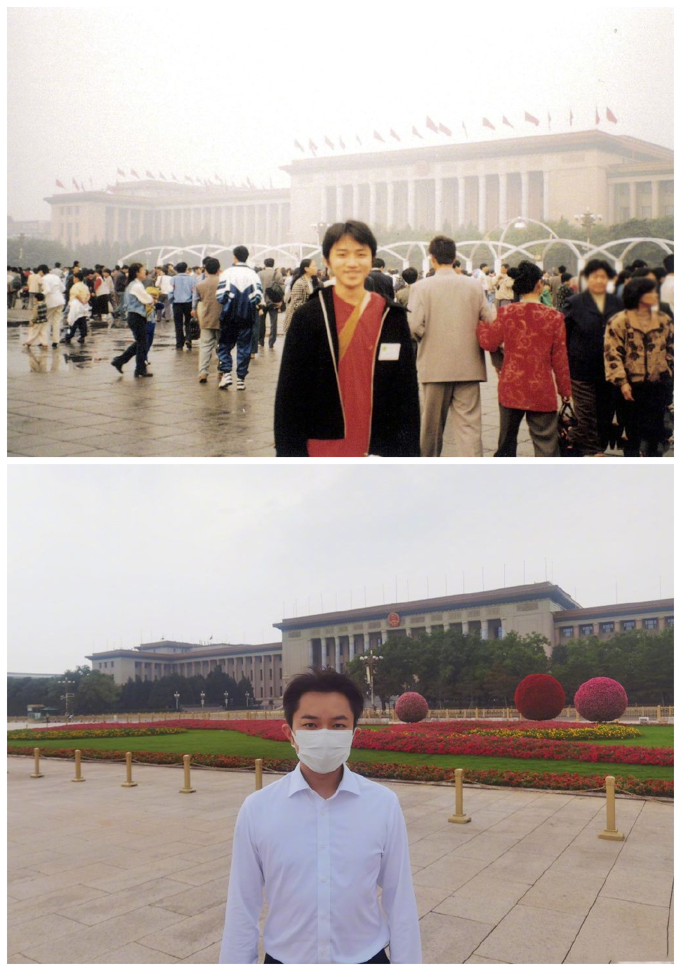 我們最后來看一下王祖藍,他是香港人,此時正在內地錄制《聲生不息》,他應該最有感觸了,因為1997年10月1日,他和同學、老師一起來北京旅游了,而且還在天安門合了影。王祖藍在微博曬出了新舊照片對比照并配文:“1997年10月1日,我在這里。2022年7月1日,我在這里,25年后依然興奮和激動!”
