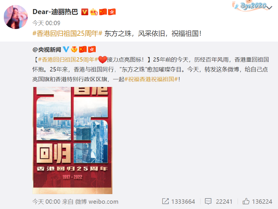 看點:2022年7月1日是香港回歸祖國25周年的日子,眾多明星發文慶祝,祝福祖國,祝福香港,我們來看看都有誰。