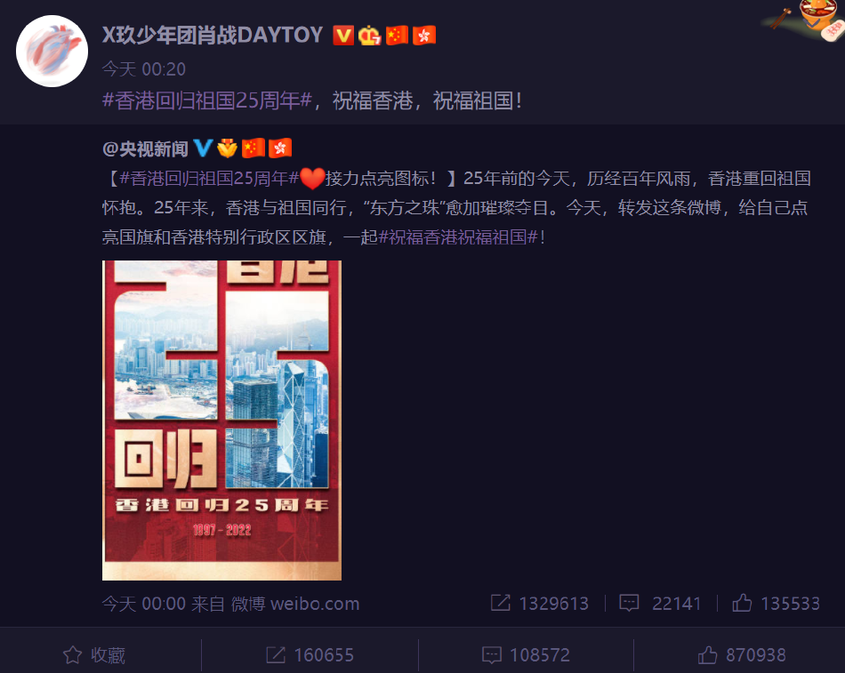 其實,他們也祝福香港了,只不過他們轉發了央視新聞的微博,所以在央視新聞的評論區里找不到他們。肖戰說:“祝福香港,祝福祖國。”