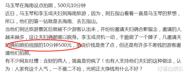 網上有人傳出,李玉成帶著馬玉琴去海南游玩的時候,看到有太多人都想跟老太太合影,所以他就靈機一動,讓馬玉琴在海南設點拍照。