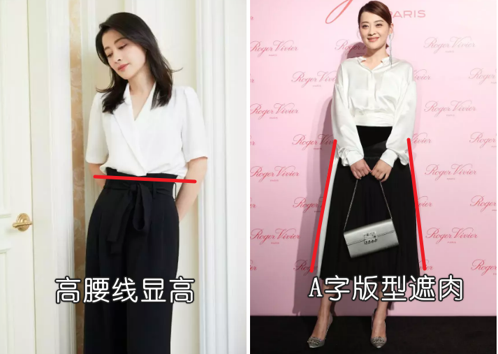又或者黑+白的碰撞,一件白色襯衫,搭配一條高腰闊腿褲或A字半身裙,將簡約進行到底,干凈利落,同時又很顯瘦、顯氣質。▼
