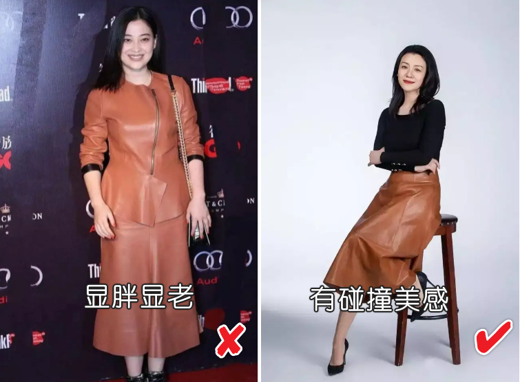 對于服裝,要選擇適合自己的款式和搭配。比如說同樣的皮質半裙,梅婷搭配同款的皮質上衣,就顯得胖且老氣,而劉琳選擇了一件黑色上衣,很好地中和了皮質半身裙的硬挺感,顯得時尚很多。▼