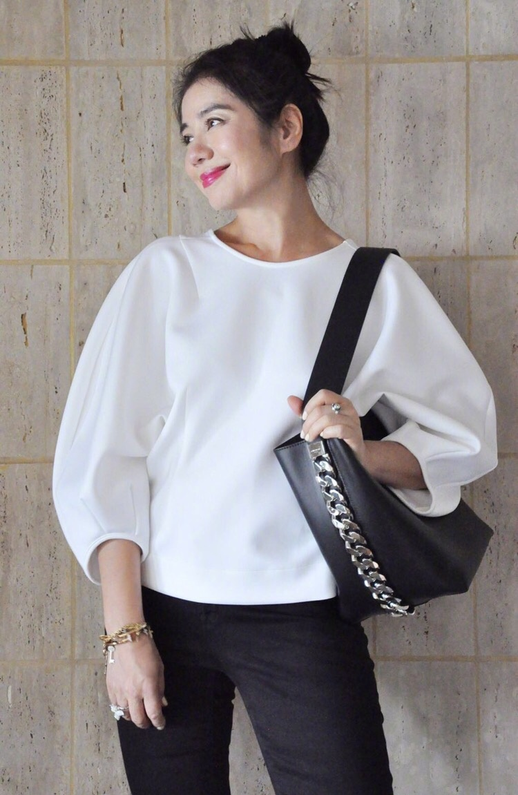 比如說她的黑色穿搭,黑色神秘又顯瘦,但全身黑會略顯老氣,此時就需要在細節上做改變了,像詠梅會選擇露出脖頸處的皮膚,以及選擇一些有設計感的元素或是選擇配飾來提亮整體。▼