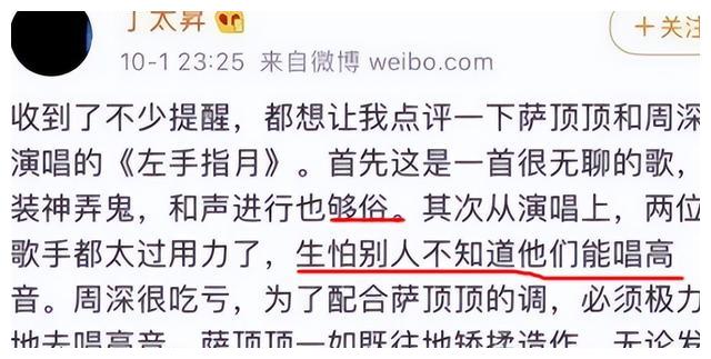看到這有點不懂,雖然是唱歌,但也是表演啊,難道要站在那一動不動地唱嗎?不知道為什么丁太升對薩頂頂的惡意這么大,他在薩頂頂和周深合唱《左手指月》后發表評論。