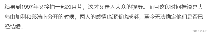 其實除了被爆料的這段日本婚姻,一直閉口不談感情的大島由加利在中國的時候也有過幾段跨國戀緋聞。最為人所知的就是和鄭浩南(就是在《古惑仔》中扮演“司徒浩南”的那個,他還有個外號叫“加錢哥”)那似有似無的婚姻。