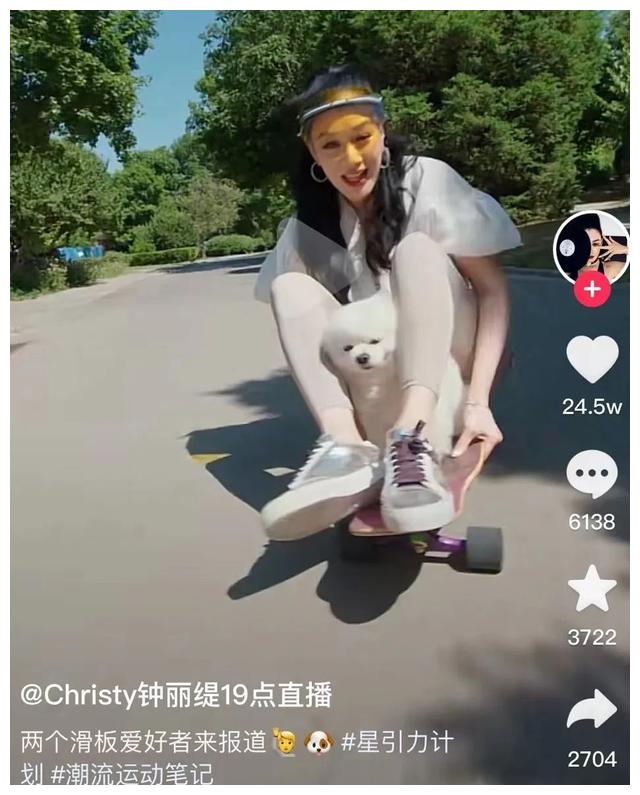 看得出來鐘麗緹不喜歡一成不變,她的心態總是像小孩一樣,活潑愛玩,對很多事情都保持好奇。她對滑板感興趣,說學就學,玩得很開心,還帶著自己的寵物狗一起玩。