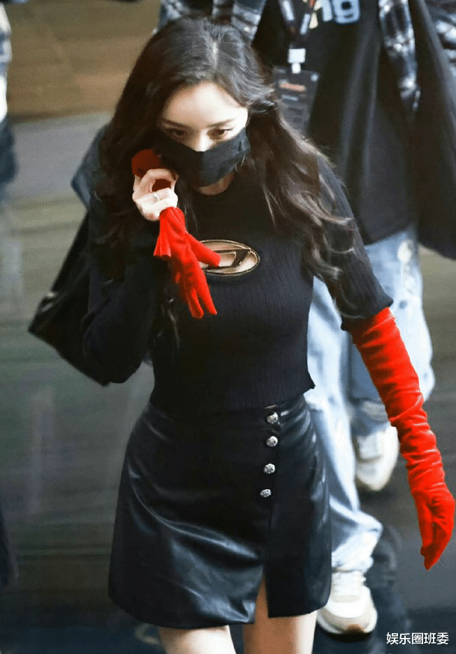楊冪身穿緊身毛衣,胸口破洞,在鏤空處鑲上一顆金屬質感的字母“D”,黑色裹臀皮裙下露出纖長的漫畫腿,手臂上戴著紅色手套,與一身黑形成強烈的視覺沖擊,讓她看起來性感又迷人,像一只魅惑動人的狐貍。