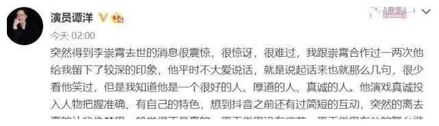 李崇霄三個月前才剛剛進組拍戲,如今走得那么突然,讓很多人難以接受。其去世的原因沒有對外公布,網友既感到震驚和悲痛,也不舍一個好演員的離去。曾與李崇霄合作過的演員譚洋發文:“很震驚,很驚訝,很難過。他平時不大愛說話,但我知道他是一個很好的人、厚道的人、真誠的人。他演戲真誠投入人物把握準確、有自己的特色,之前還有過簡短的互動,突然的離去真的讓我像夢里一般覺得不是真的。愿天堂里沒有痛苦,愿天堂里有他的舞臺繼續創作,一路走好。”