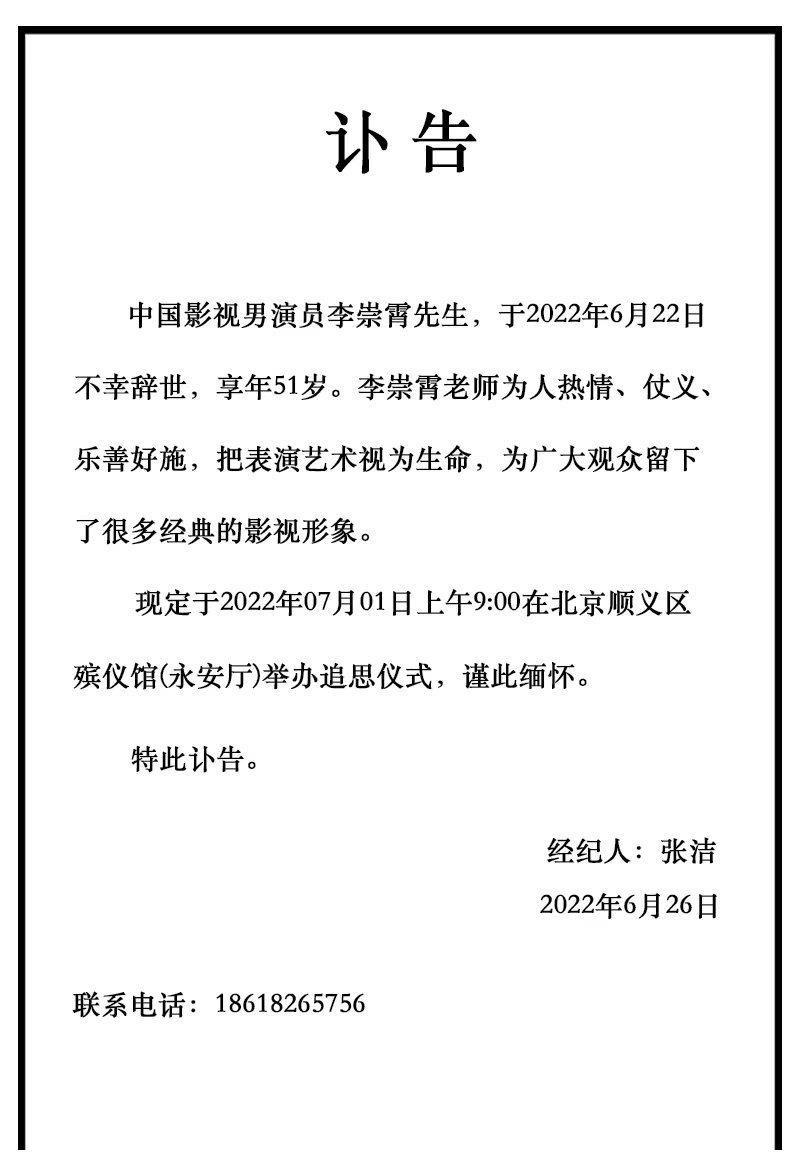 6月26日晚間,經紀人張潔發布訃告:中國影視男演員李崇霄先生,于6月22日不幸辭世,享年51歲。李崇霄老師為人熱情、仗義、樂善好施,把表演藝術視為生命,為廣大觀眾留下了很多經典的影視形象?,F定于2022年07月01日上午9:00在北京順義區殯儀館(永安廳)舉辦追思儀式,謹此緬懷