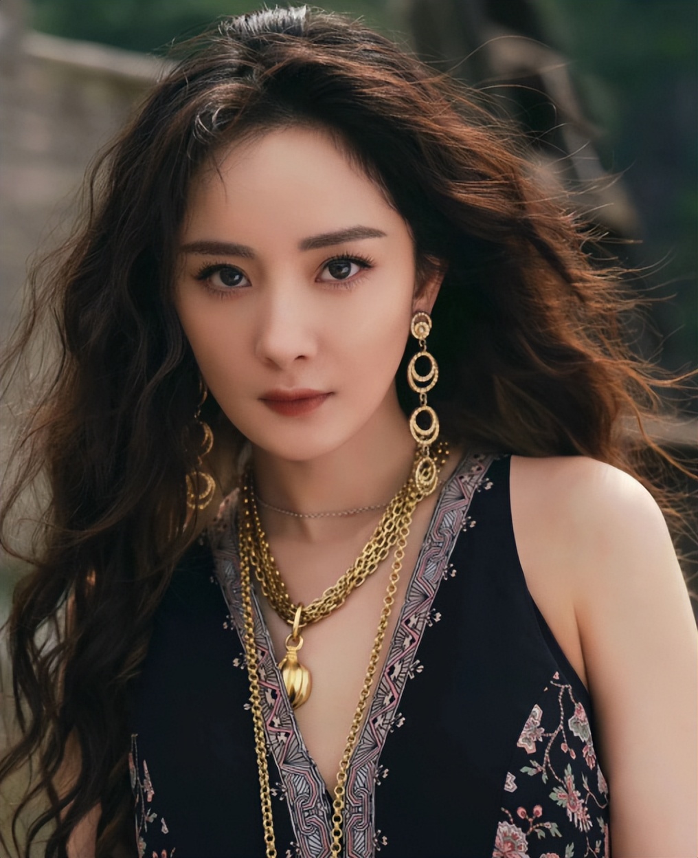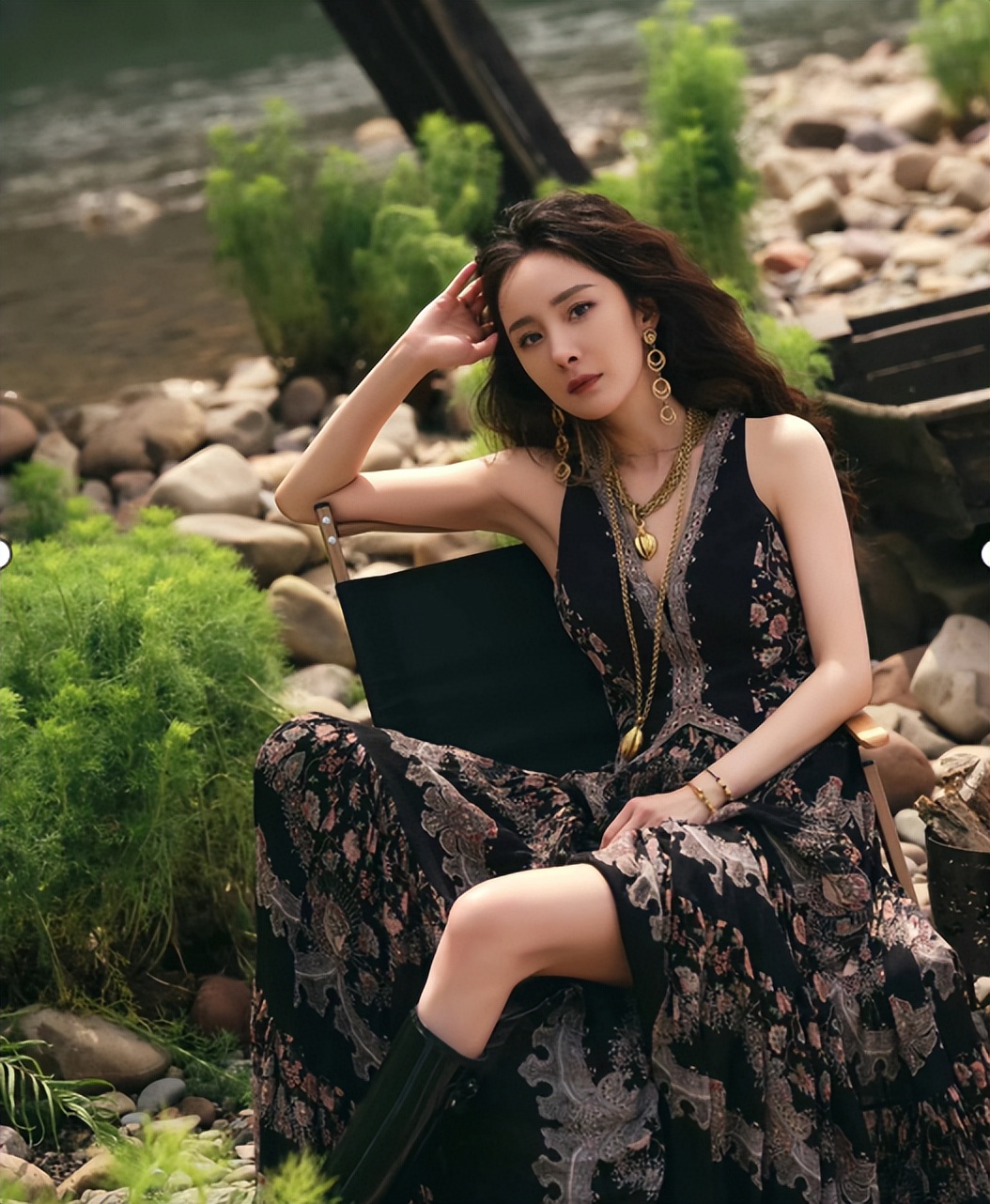 楊冪本次的造型透露著狂放不羈的野性美感,她身穿一身黑色的碎花拖地長裙,井然有序的花紋使服裝整體別有一番韻味,細膩白皙的脖頸上戴著兩條顯眼的金色項鏈,與深V的領口形成呼應,一頭棕色的大波浪在陽光下的照耀下閃閃發光,充滿力量的眼神堅定地凝視著正前方,露出的一條白皙長腿十分性感。
