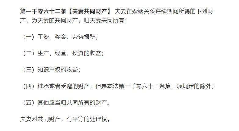 首先,這就不得不說我們國內的法律了,我們國家的《民法典》就規定了非常詳細的夫妻共同財產的說法,根據民法典的1062條法律規定,夫妻雙方在婚姻取得的一切收入,包括了工資、獎金以及各種其他零零總總的收入在內,夫妻雙方都具備平等分割的權利,也就意味著這些收入,離婚時也是要被拿出來平等分割的。