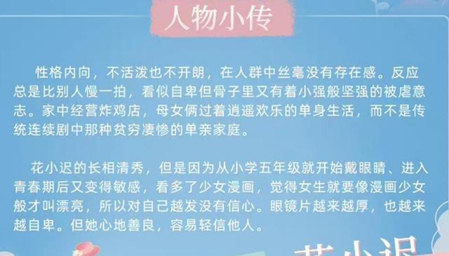 女主花小遲則是由新晉高顏值人氣小花劉些寧飾演,是一位性格自卑卻又如小強(qiáng)般堅(jiān)強(qiáng)善良的清純甜妹。此角色對于愛豆出道且表演經(jīng)驗(yàn)生疏的劉些寧來說是一次前所未有的大挑戰(zhàn)。