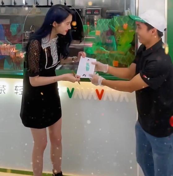 在一個關(guān)曉彤所代言的奶茶店內(nèi),一個穿著樸素一臉老實相的男粉絲正在等待著關(guān)曉彤簽名,當天的關(guān)曉彤穿著一件黑色的薄紗小短裙,年近24歲的她顯得非常成熟、穩(wěn)重。