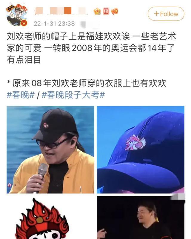 樂壇巨星劉歡的唱功實力毋容置疑, 好久不見的他回歸虎年的春晚晚會上。劉歡身材仍舊肥胖,肚子大大,穿著黃色的外套,頭戴鴨舌帽,整體打扮樸素低調。眼尖的網友發現,帽子的正面有一個圖案,細細看竟然是2008年北京奧運會的吉祥物——福娃“歡歡”的圖案。事隔14年了,劉歡依然戴著這頂帽子登臺表現,可謂抓人眼球。