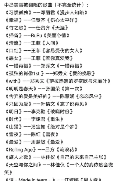 雖然我們覺得這些話太夸張了,甚至要極力反對這些話,但是我們不得不承認,確實,最初那些年,大熱的歌曲都是從日本歌手的歌曲翻唱而來的。很多人的歌都翻唱自中島美雪的歌,中島美雪一輩子寫了六百多首歌,四五百首都曾被翻唱過,而且不僅我們國家的人喜歡翻唱她的歌曲,甚至別的歐美國家的歌手也喜歡翻唱她的歌。