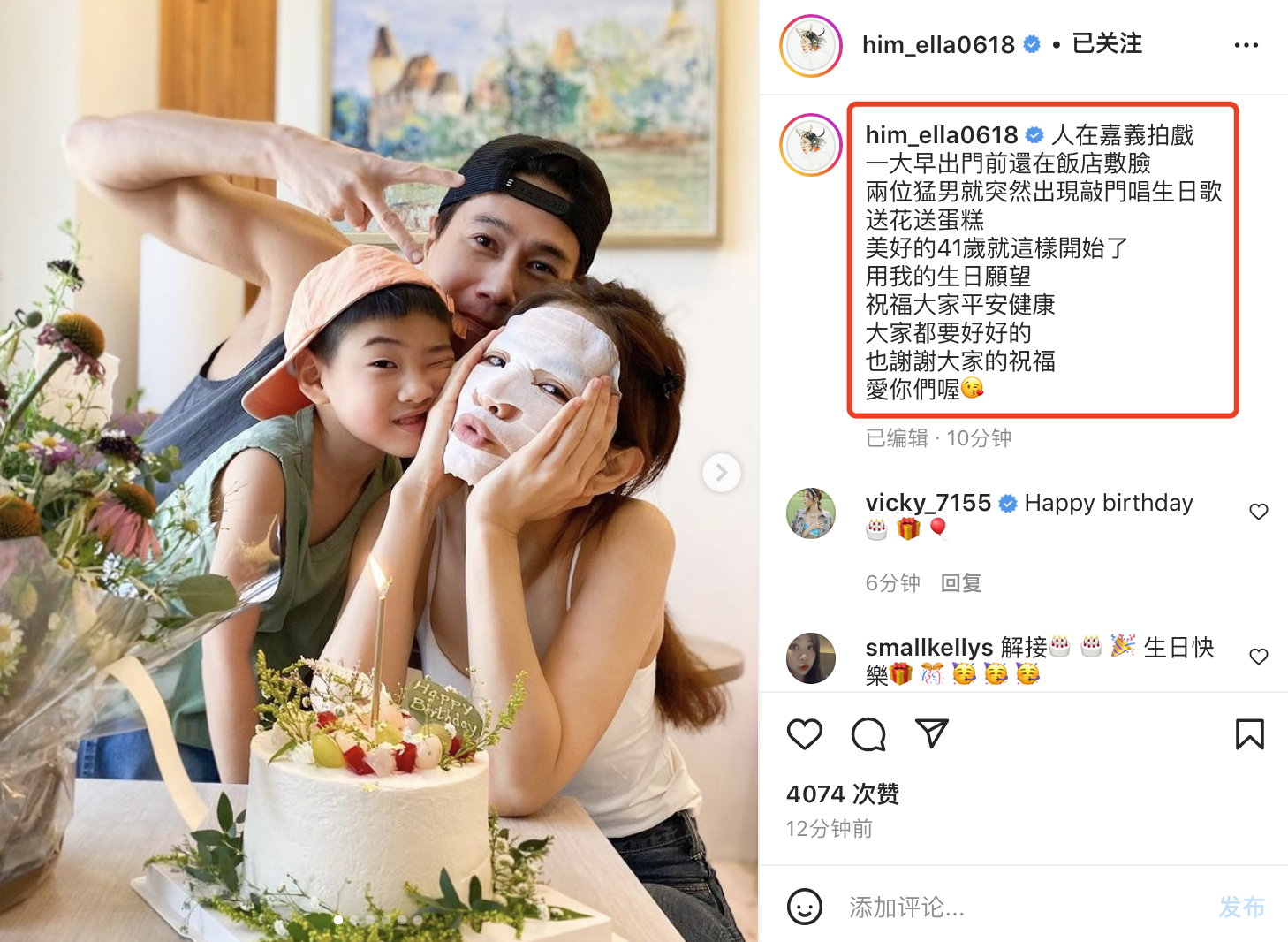 6月18日,Ella分享全家福慶祝41歲生日。她透露自己目前在拍戲,住的是酒店,出門前敷著面膜,老公和兒子突然敲門,帶來鮮花和蛋糕,為自己唱生日歌,就這樣,她開始了美好的41歲。